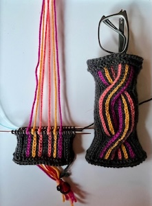 The beauty happens in creative applications. We will work the technique into a colorful cable or a lace pattern, student’s choice to make a pair of wrist warmers or a phone/glasses case.