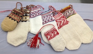 The Sámi are Scandinavia’s only UN-recognized indigenous people and have a culture rich with fiber traditions. In this class, students will be introduced to Sámi mittens and some of the more difficult techniques while creating several swatches: right and left leaning slyngborden (knitted braid,) three ways to do right and left leaning slyngborden cast-ons (in two and three colors,) and a 4-strand, round braid with tassels.